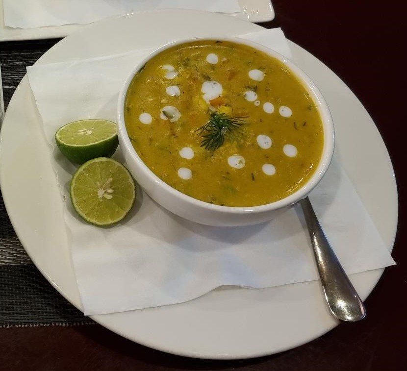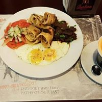 Lamb cubes with vegetables and local spices wrapped with crepes, two eggs of your choice with a cup of coffee